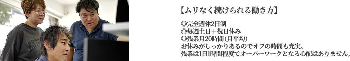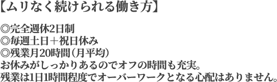 | 就業時間 | 9:00~18:00(休憩60分) ※残業は月平均20時間程度です。 |