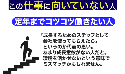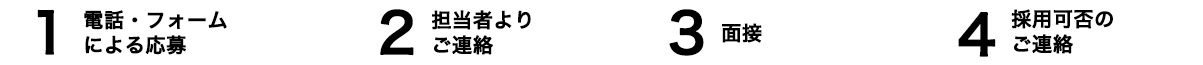 | 選考について | 「応募フォーム」よりお送りいただいた内容をもとに書類選考を行います。 書類選考通過後は本社にて面接を行います。人物重視の採用です! ※面接時に履歴書(写真貼付)・職務経歴書をお持ちください。 |